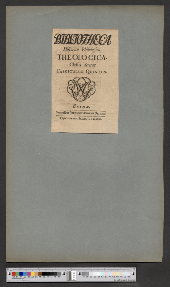 - BREMAE, / Sumptibus JOHANNIS ANDREAE GRIMMII / Typis HERMANNI BRAUERI, M D CCXXIII.