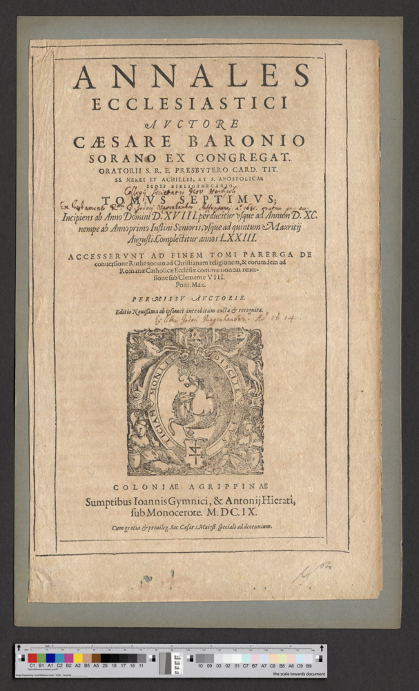 - COLONIAE AGRIPPINAE / Sumptibus Ioannis Gymnici, & Antonij Hierati, / sub Monocerote. M. DC. IX. / Cum gratia & privileg. Sac. Caesar. Maiest. Speciali ad decennium.