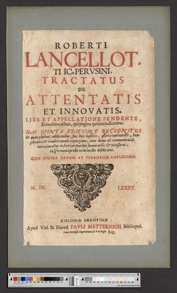 - M. DC. LXXXV. / COLONIAE AGRIPPINAE / Apud Vid. & Haered. PAVLI METTERNICH Bibliopol.