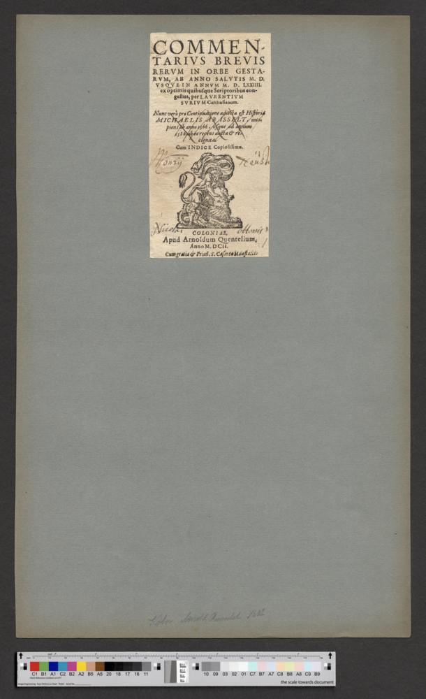 - COLONIAE, / Apud Arnoldum Quentelium, / Anno M. DCII.