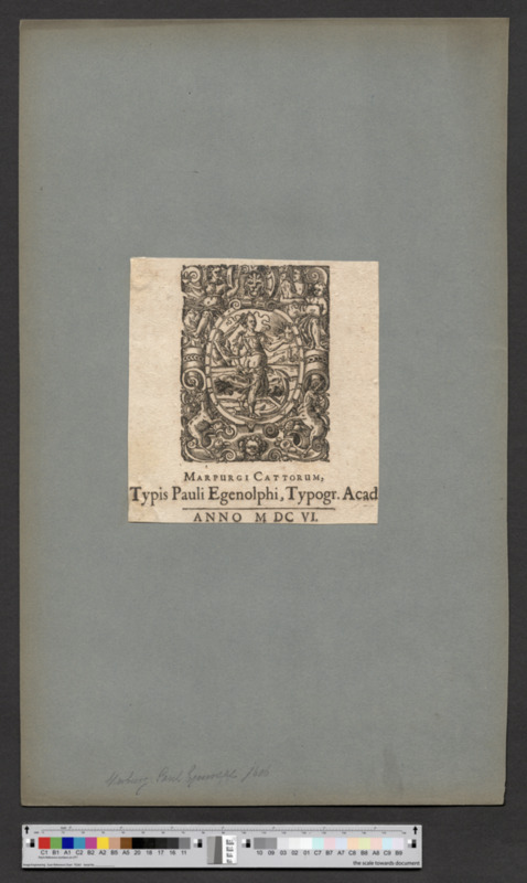 - MARPURGI CATTORUM, / Typis Pauli Egenolphi, Typogr. Acad / ANNO M DC VI.