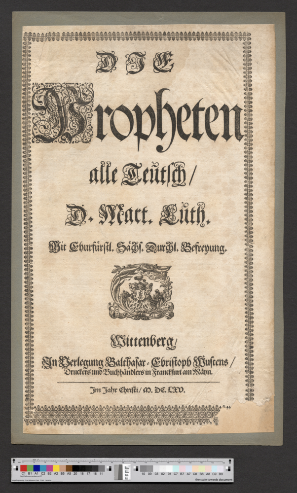 - Wittenberg/ / In Verlegung Balthasar-Christoph Wustens / / Druckers und Buchhändlers in Franckfurt am Mäyn. / Im Jahr Christi/ M. DC. LXV.