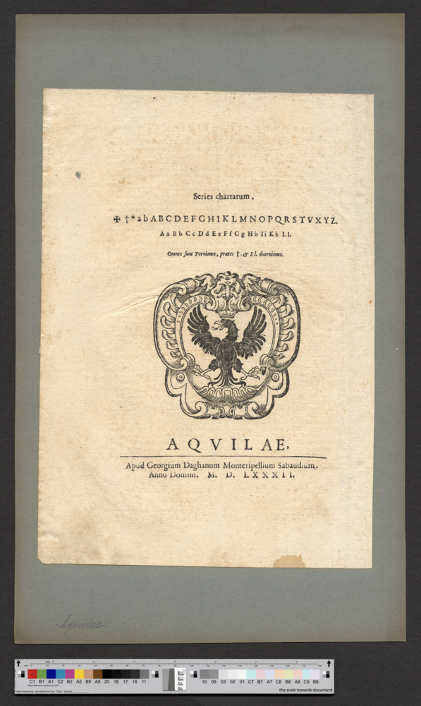 - AQVILAE, / Apud Georgium Daghanum Monteripellium Sabaudium. / Anno Domini. M. D. LXXXII.