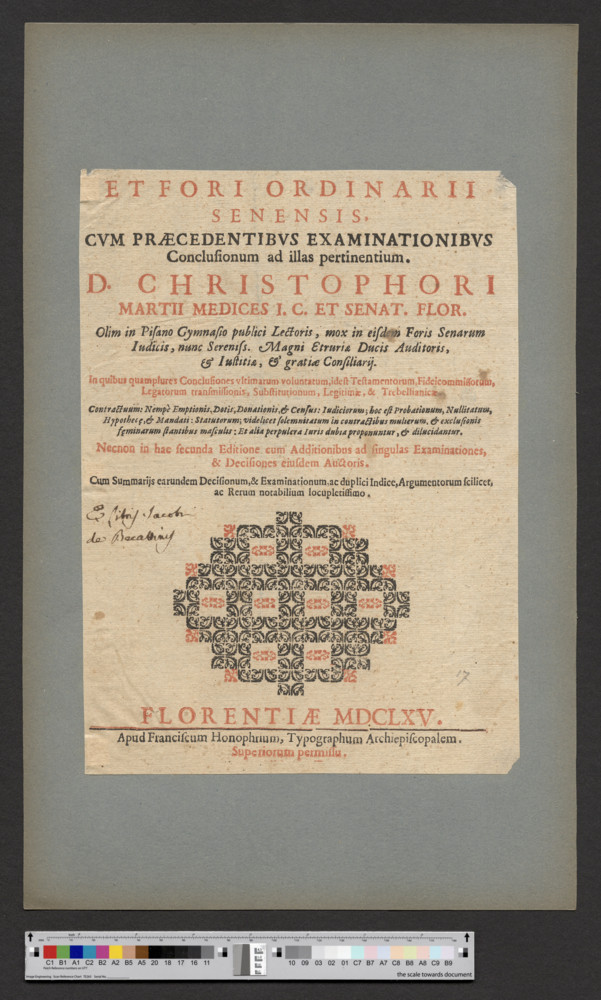 - FLORENTIAE MDCLXV. / Apud Franciscum Honophrium, Typographum Archiepiscopalem.