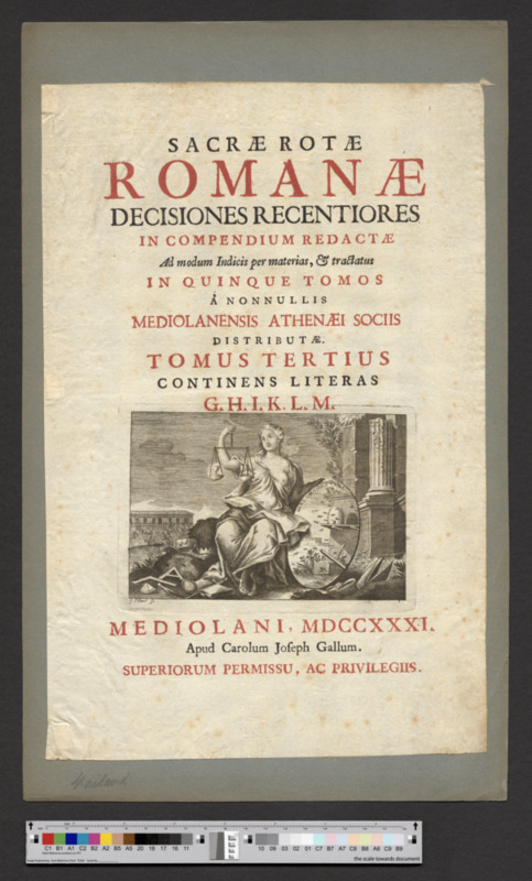 - MEDIOLANI, MDCCXXXI. / Apud Carolum Joseph Gallum. / SUPERIORUM PERMISSU, AC PRIVILEGIIS.
