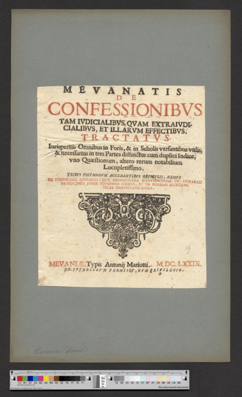 - MEVANIAE, Typis Antionij Mariotti. M. DC. LXXIX. / DD. SVPERIORVM PERMISSV PRIVILEGIO.