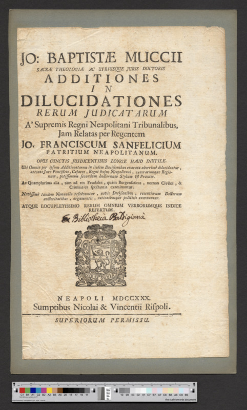 - NEAPOLI MDCCXXX. / Sumptibus Nicolai & Vincentii Rispoli. / SUPERIORUM PERMISSU.