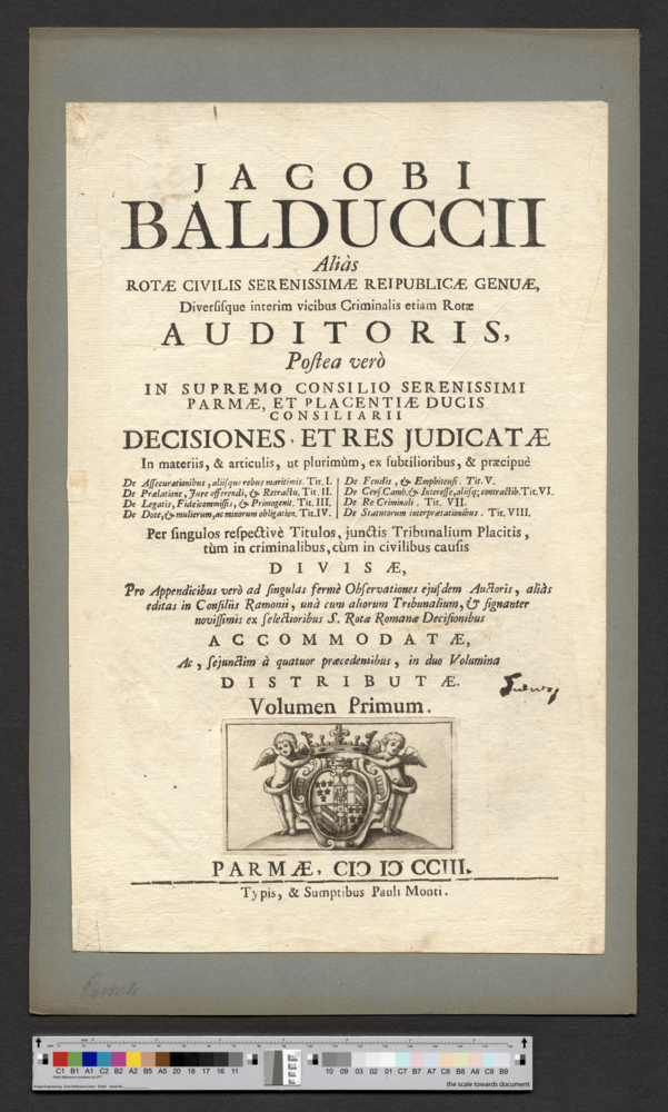 - PARMAE, CIↃ IↃ CCIII. / Typis, & Sumptibus Pauli Monti.