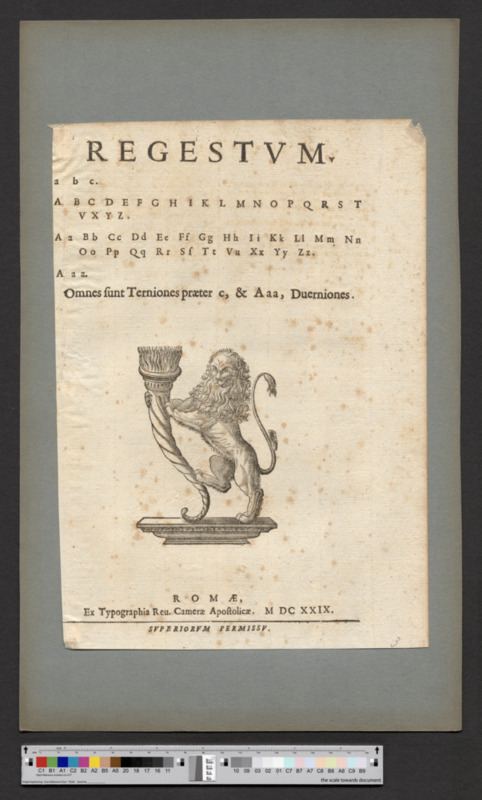 - ROMAE/ Ex Typographia Rev. Camerae Apostolicae. M DC XXIX. / Superiorum Permissu.