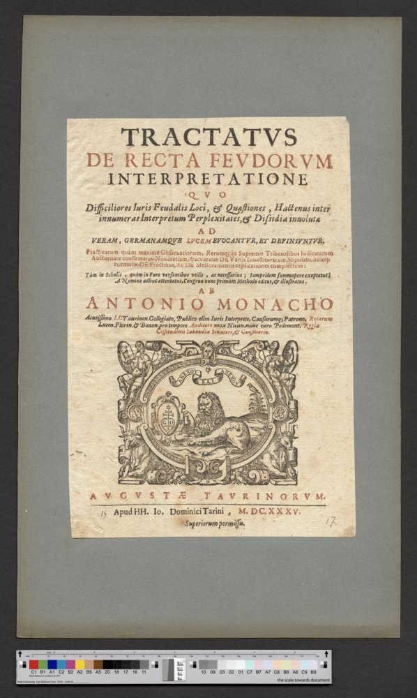 - AVGVSTAE TAVRINORVM. / Apud HH. Io. Dominici Tarini, M. DC. XXXV. / Superiorum permissu.