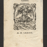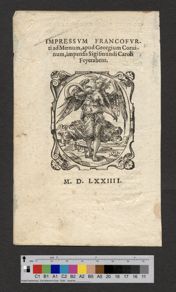 - IMPRESSVM FRANCOFVR- / ti ad Moenum, apud Georgium Corui- / num, impensis Sigismundi Caroli / Feyerabent. / M. D. LXXIIII.