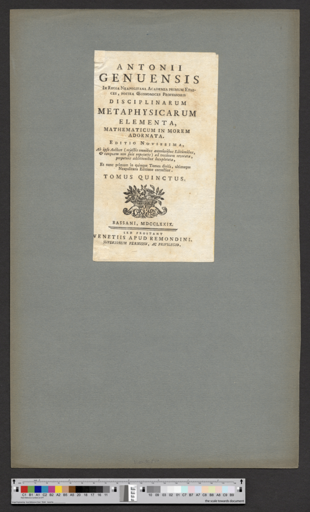- BASSANI, MDCCLXXIX. / SED PROSTANT / VENETIIS APUD REMONDINI. / SUPERIORUM PERMISSU, AC PRIVILEGIO.