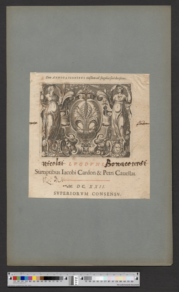 - LVGDVNI, / Sumptibus Iacobi Cardon & Petri Cauellat. / M. DC. XXII. / SVPERIORVM CONSENSV.