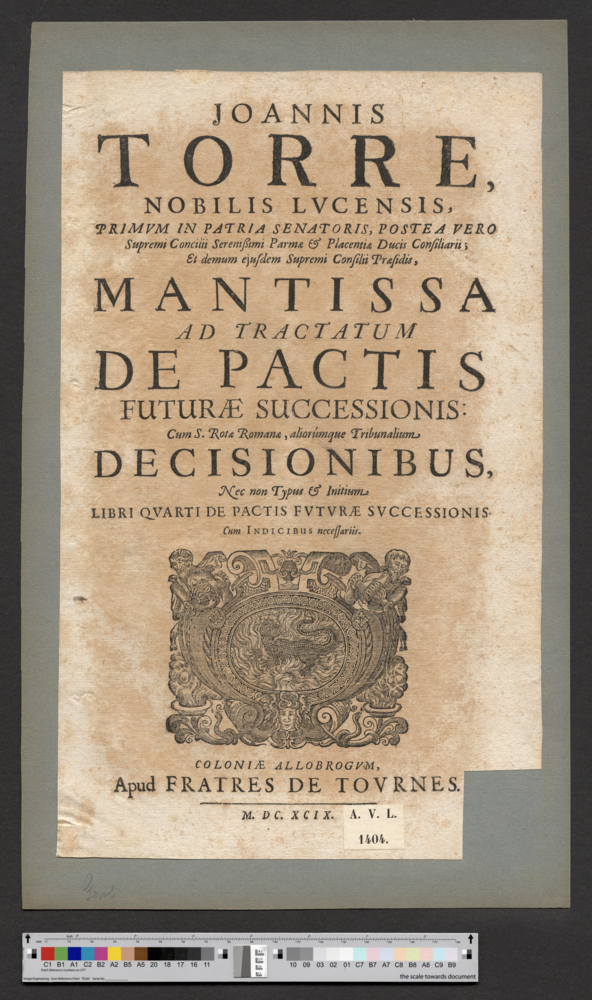 - COLONIAE ALLOBROGUM, / Apud FRATRES DE TOVRNES. / M. DC. XCIX.