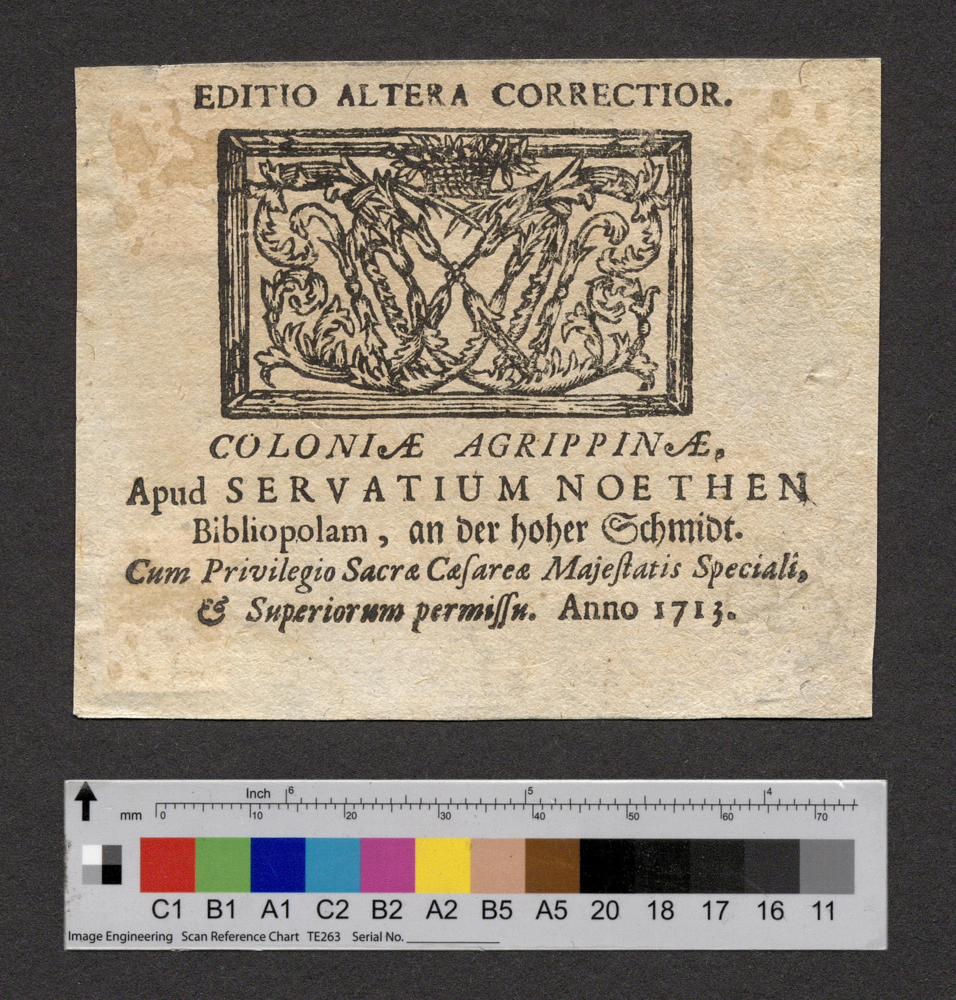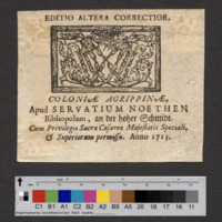 - COLONIAE AGRIPPINAE, / Apud SERVATIUM NOETHEN / Bibliopolam, an der hoher Schmidt. / Cum Privilegio Sacrae Caefareae Majestatis Speciali, / & Superiorum permissu. / Anno 1713.