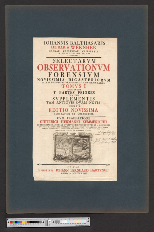 - IENAE / SVMPTIBVS IOHANN. BERNHARD. HARTVNGII / ANNO MDCCXXXVIII.