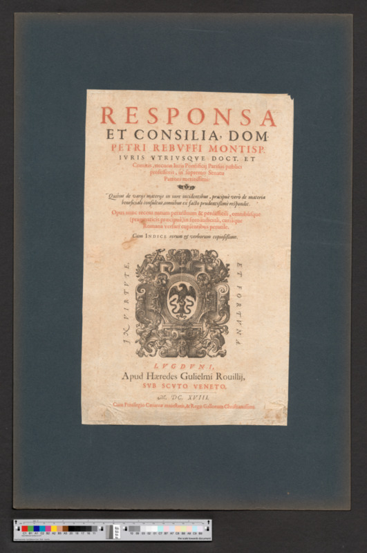 - LVGDVNI, / Apud Haeredes Gulielmi Rouillij, / SVB SCVTO VENETO. / M. DC. XVIII. / Cum Priuilegio Caetareae maiestatis, & Regis Gallorum Christianissimi.