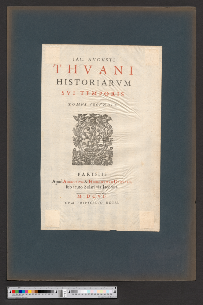 - PARISIIS, / Apud AMBROSIVM & HIERONYMVM DROVART, / sub scuto Solari via Iacobaea. / M. DCVI. / CVM PRIVILEGIO REGIS.