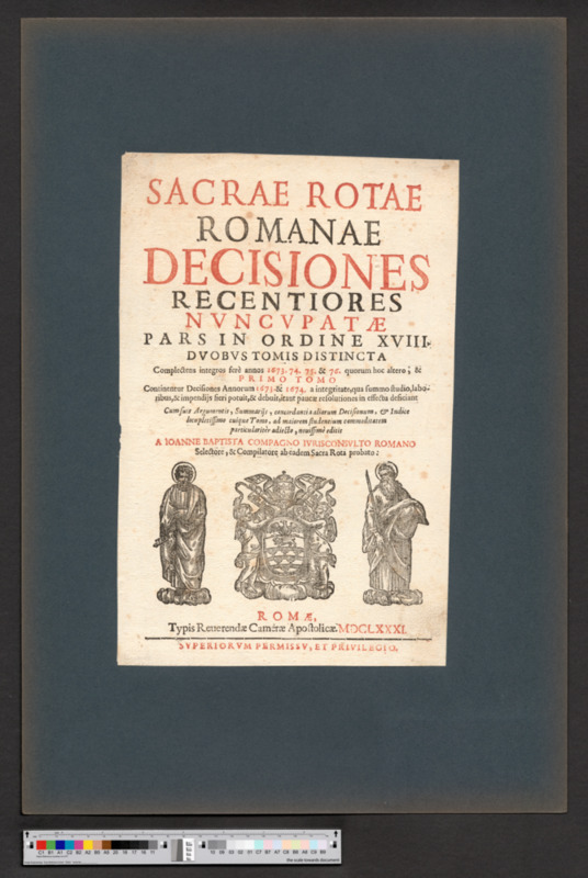 - ROMAE, / Typis Reuerendae Camerae Apostolicae. MDCLXXXI. / SVPERIORVM PERMISSV, ET PRIVIEGIO.