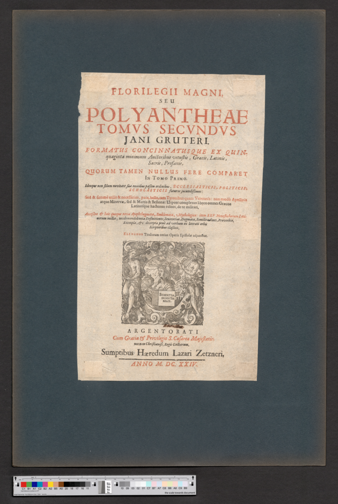 - ARGENTORATI / Cum Gratia & Privilegio S. Cesarea Majestatis, / necnon Christianiss. Regis Galliarum. / Sumptibus Haeredum Lazari Zetzneri. / ANNO M. DC. XXIV.