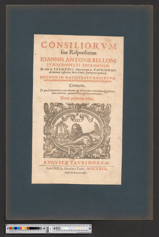 - AVGVSTAE TAVRINORVM. / Apud HH. Io. Dominici Tarini, MDCXXIII. / Superiorum permissu.