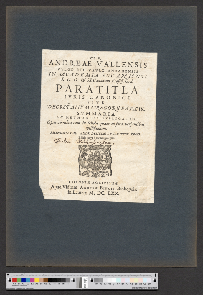 - COLONIAE AGRIPPINAE, / Apud Viduam ANDREAE BINGII Bibliopolae / in Laureto M. DC. LXX.