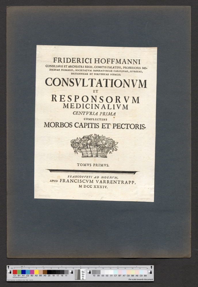 - FRANCOFVRTI AD MOENVM, / APVD FRANCISCVM VARRENTRAPP, / M DCC XXXIV.