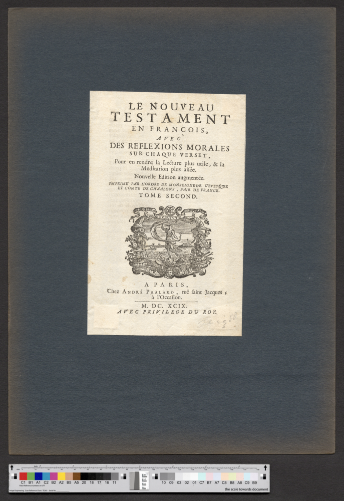 - A PARIS , / Chez ANDRÉ PRALARD , ruë saint Jacques , / à l'Occasion. / M. DC. XCIX. / AVEC PRIVILEGE DU ROY.