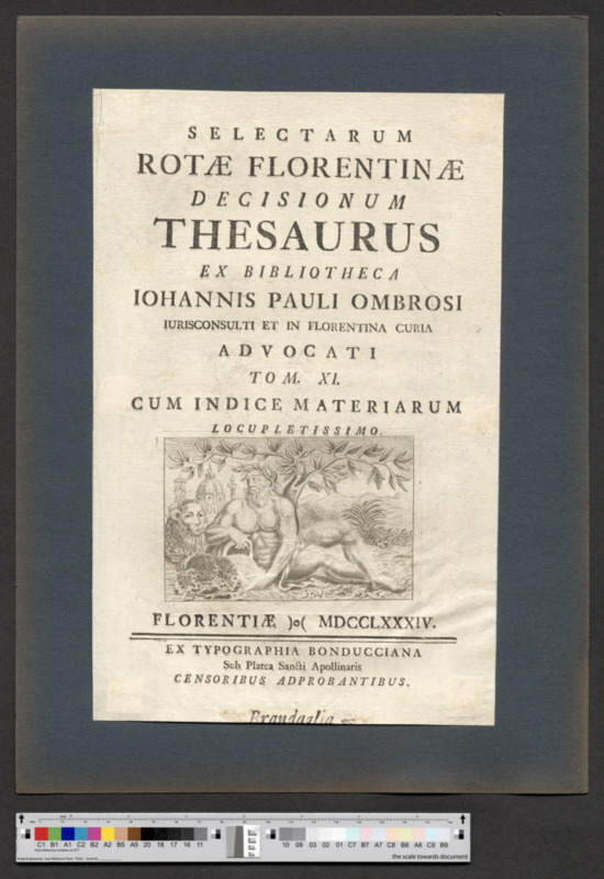 - FLORENTIAE )ο( MDCCLXXXIV. / EX TYPOGRAPHIA BONDUCCIANA / Sub Platea Sancti Apollinaris / CENSORIBUS ADPROBANTIBUS.