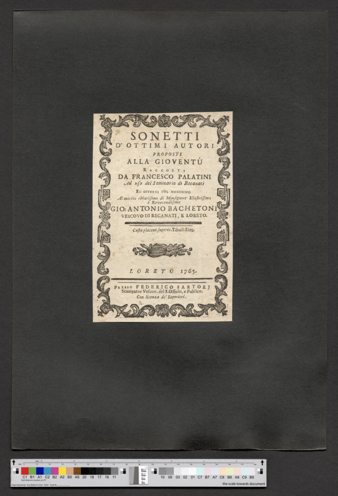 - LORETO 1765. / PRESSO FEDERICO SARTORJ / Stampator Vescov. del S. Officio, e Publico. / Con licenza de' Superiori.