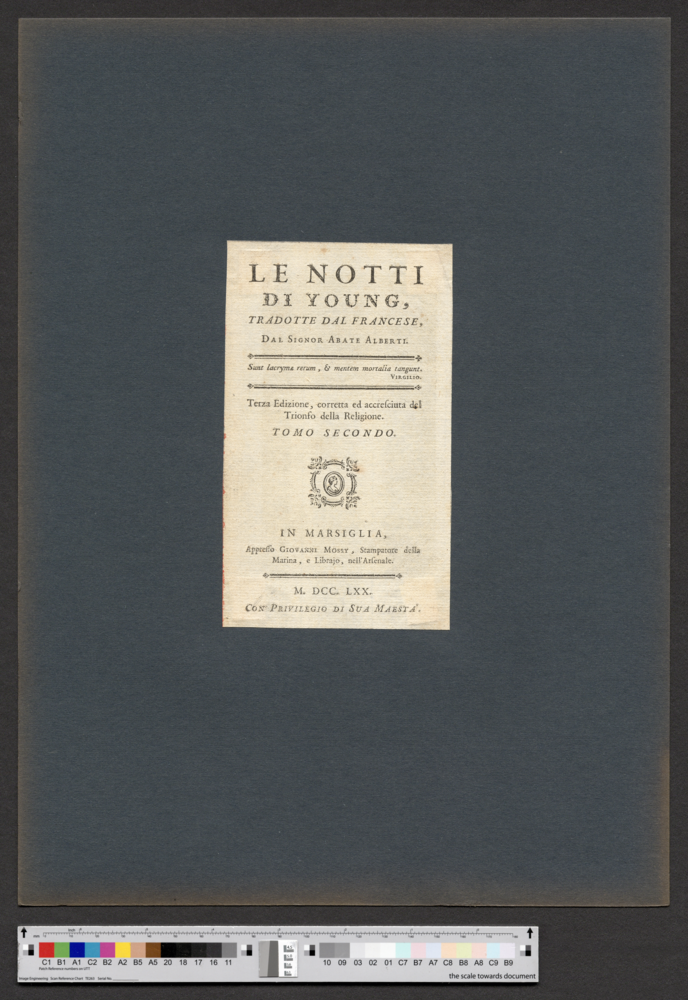 - IN MARSIGLIA, / Appresso GIOVANNI MOSSY, Stampatore della / Marina, e Librajo, nell' Arsenale. / M. DCC. LXX. / CON PRIVILEGIO DI SUA MAESTA.