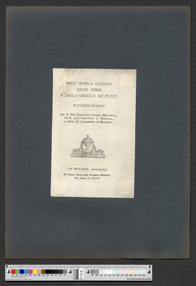 - IN MILANO. MDCCLXXXVI. / Per Cesare Orena nella Stamperia Malatesta / Con licenza de' Superiori.