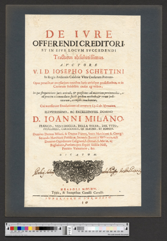 - NEAPOLI M. DC. XCV. / Typis, & Sumptibus Camilli Cavalli. / SUPERIORUM PERMISSU.