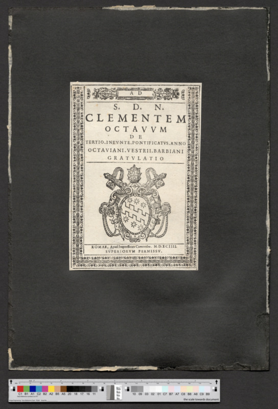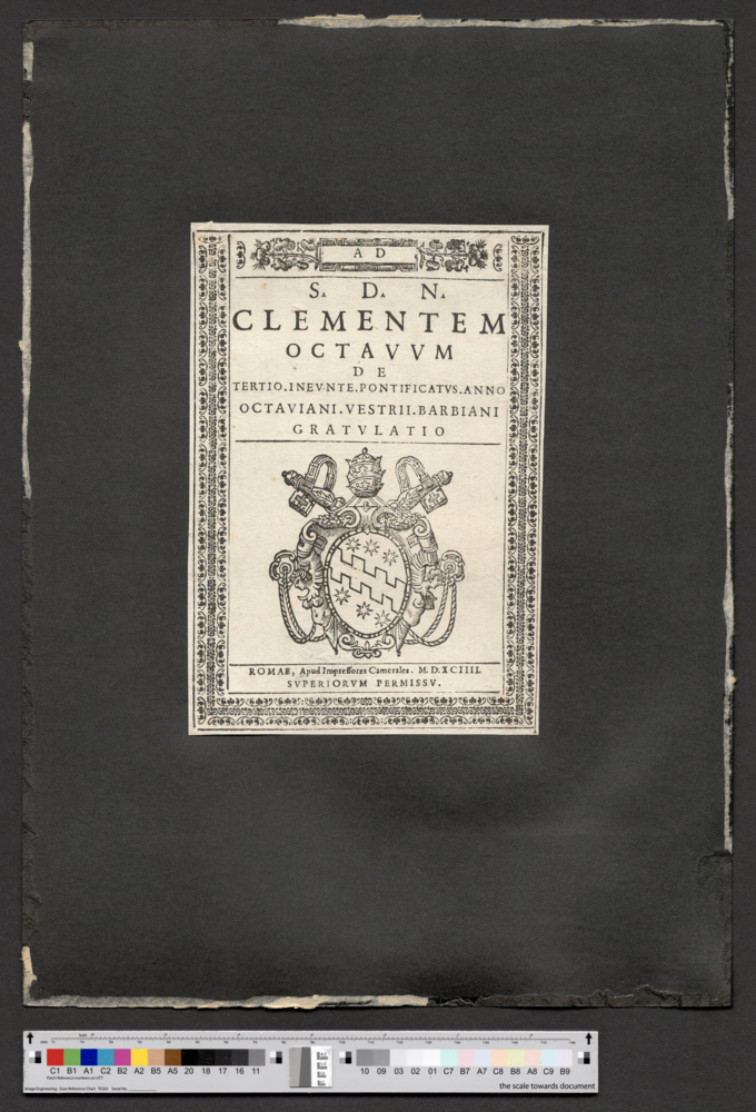 - ROMAE, Apud Impressores Camerales. M. D. XCIIII. / SVPERIORVM PERMISSV.