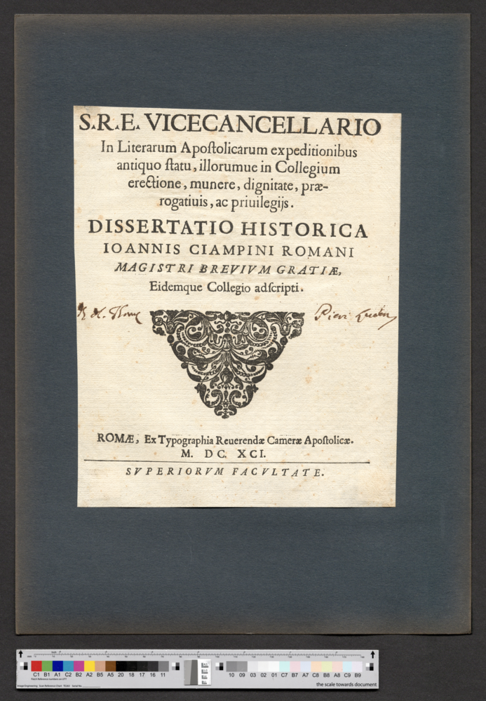 - ROMAE, Ex Typographia Reuerendae Camerae Apostolicae. / M. DC. XCI. / SVPERIORVM FACVLTATE.