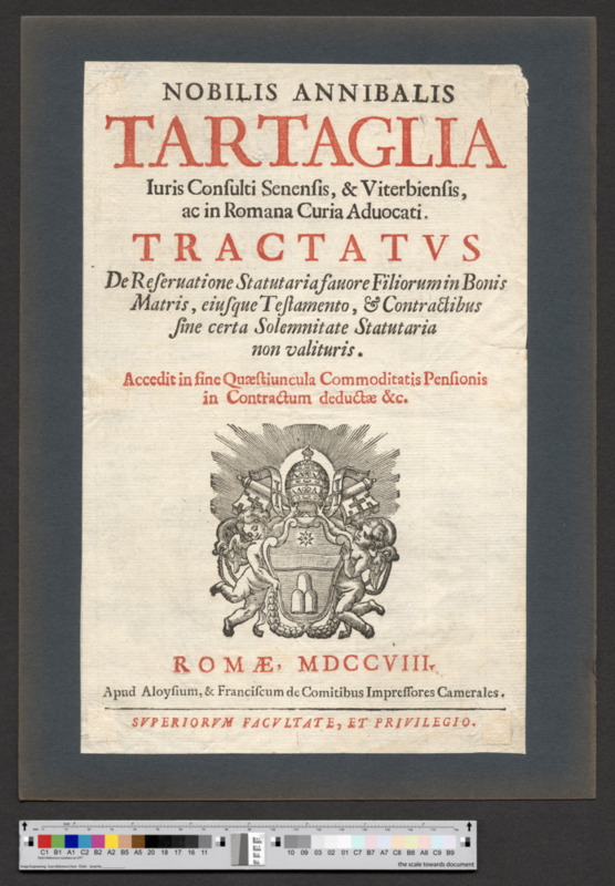 - ROMAE, MDCCVIII. / Apud Aloysium, & Franciscum de Comitibus Impressores Camerales. / SVPERIORVM FACVLTATE, ET PRIVILEGIO.