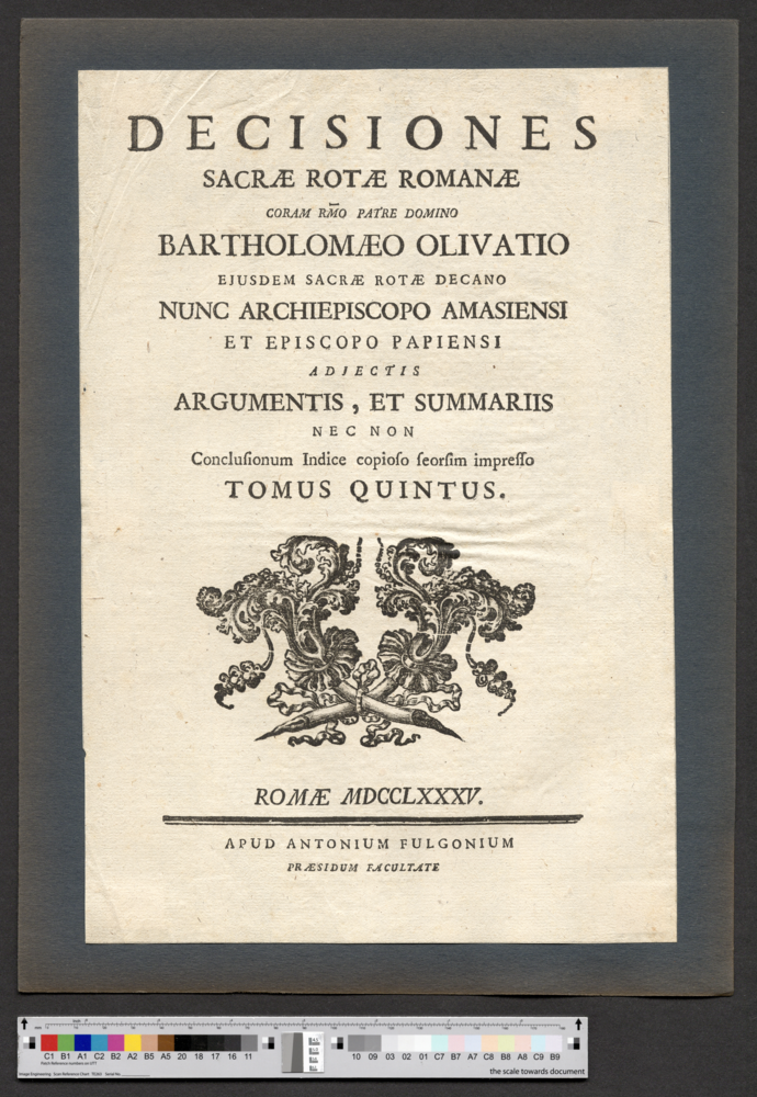 - ROMAE MDCCLXXXV. / APUD ANTONIUM FULGONIUM / PRAESIDUM FACULTATE