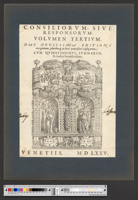 - Titelblatt mit dem Allianzsignet von Francesco de Franceschi, Gaspare Bindoni, Niccolò Bevilacqua und Damiano Zenaro