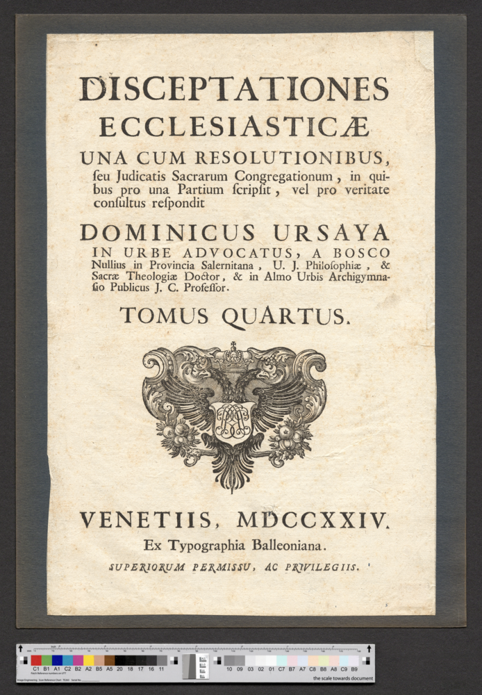 - VENETIIS, MDCCXXIV. / Ex Typographia Balleoniana, / SUPERIORUM PERMISSU, AC PRIVILEGIIS.