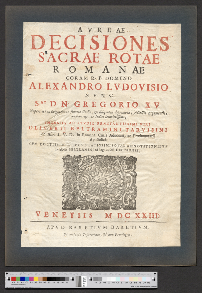 - VENETIIS M DC XXIII. / APVD BARETIVM BARETIVM. / De consensu Superiorum, & cum Privilegijs.