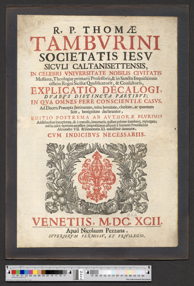 - VENETIIS, M.DC. XCII. / Apud Nicolaum Pezzana. / SVPERIORVM PERMISSV, ET PRIVILEGIO.