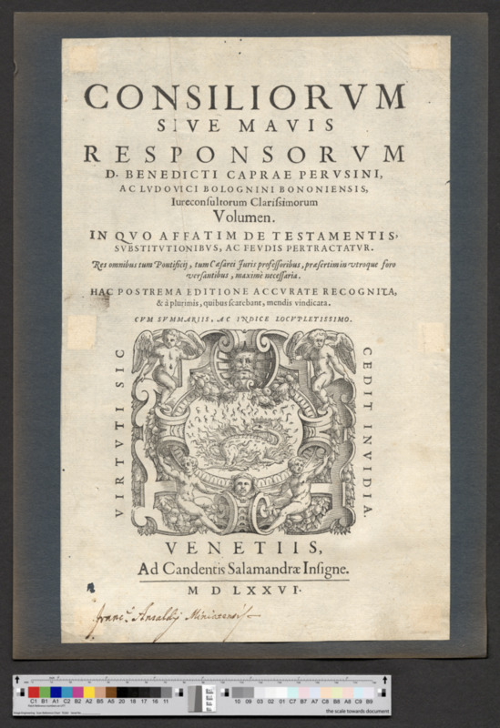 Titelblatt mit dem Druckerzeichen von der Offizin Ad candentis Salamandrae insigne