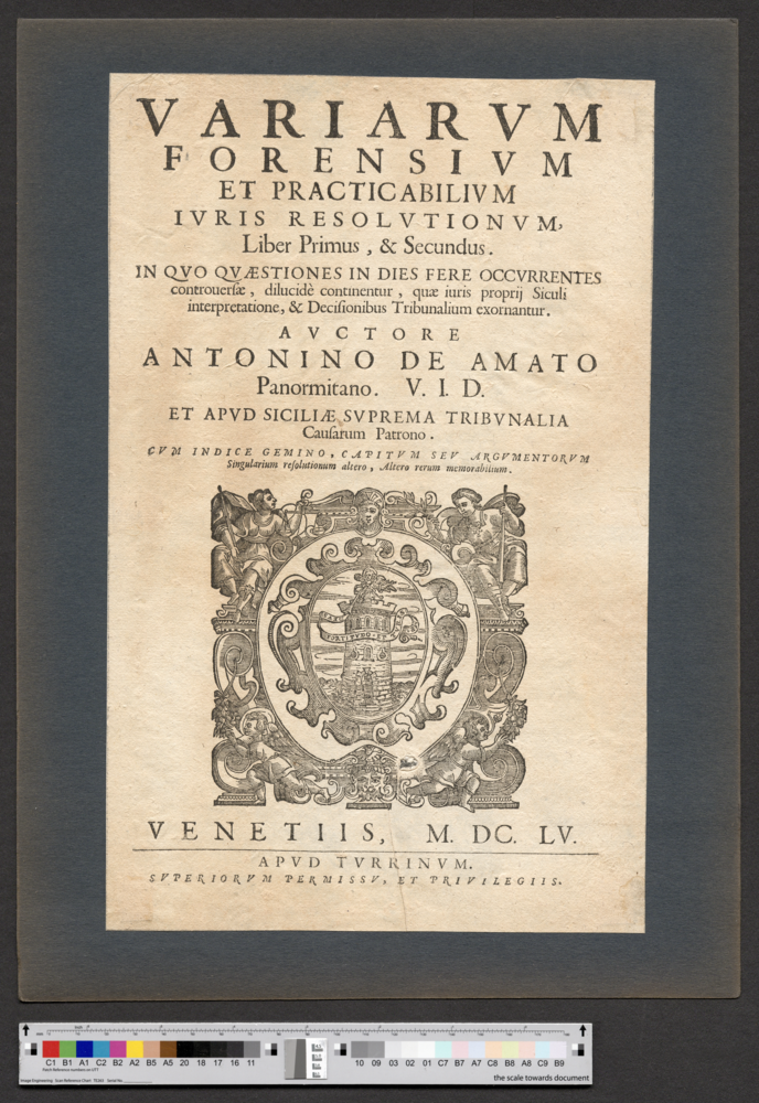- VENETIIS, M. DC. LV. / APVD TVRRINVM. / SVPERIORVM PERMISSV, ET PRIVILEGIIS.