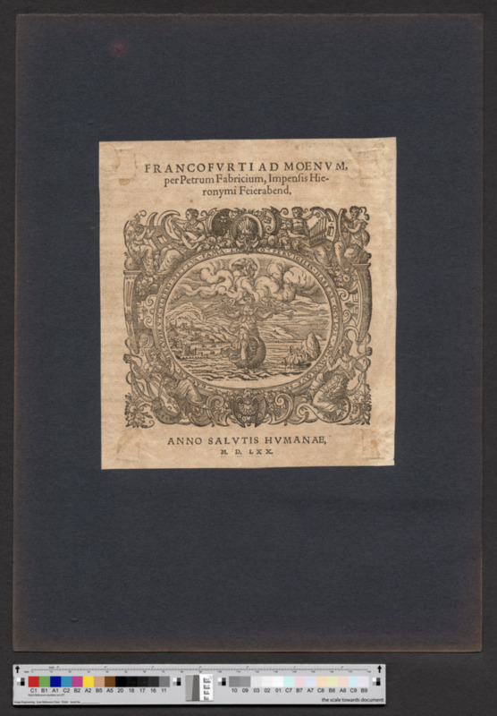 - FRANCOFVRTI AD MOENVM, / per Petrum Fabricium, Impensis Hie- / ronymi Feierabend, / ANNO SALVTIS HVMANAE, / M. D. LXX.