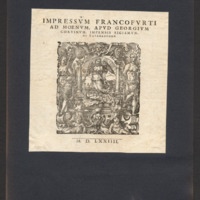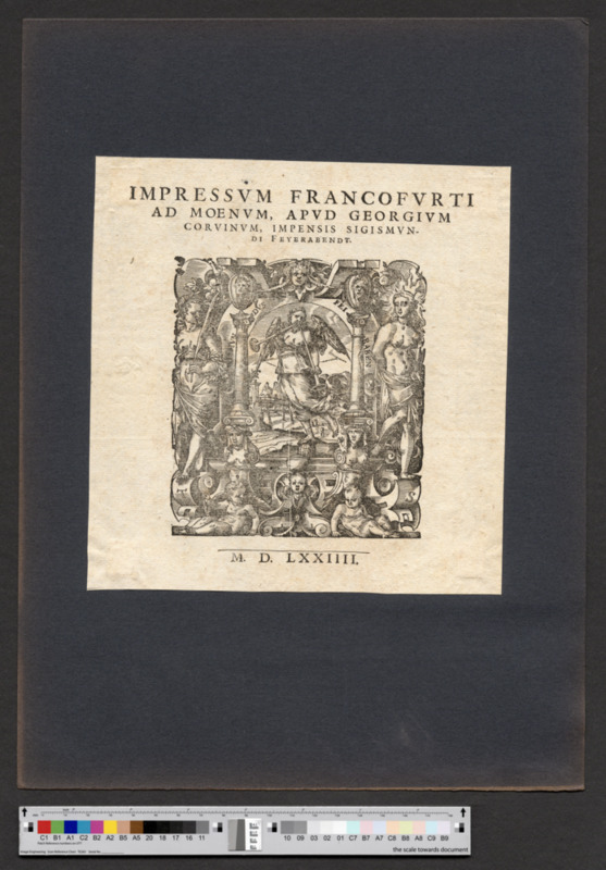 - IMPRESSVM FRANCOFVRTI / AD MOENVM, APVD GEORGIVM / CORVINVM, IMPENSIS SIGISMVN- /DI FEYERABENDT. / M. D. LXXIIII.