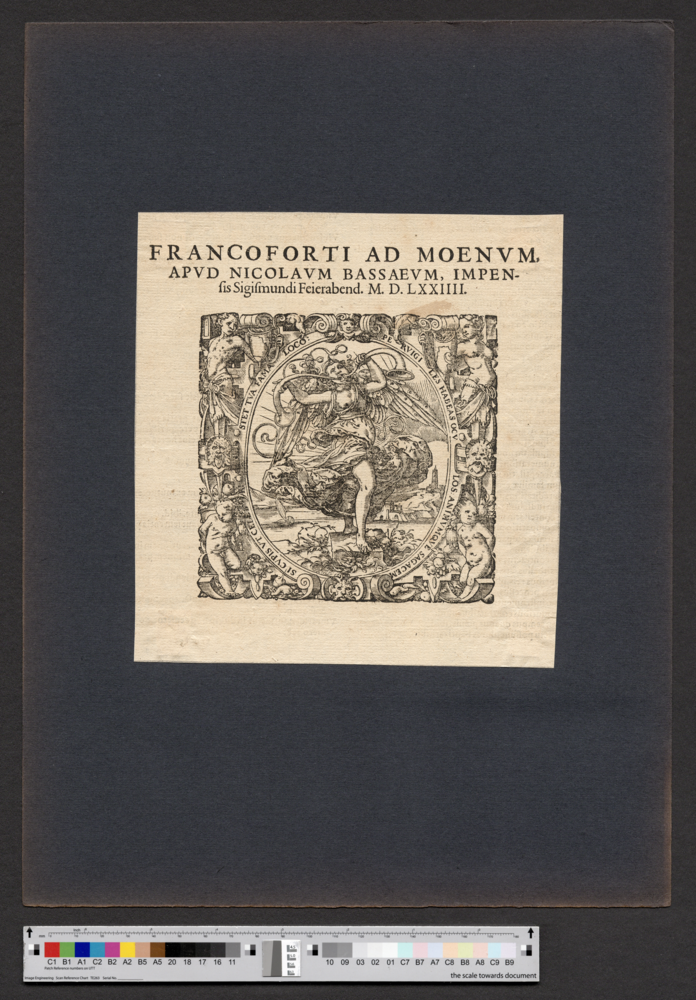 - FRANCOFORTI AD MOENVM, / APVD NICOLAVM BASSAEVM, IMPEN- / sis Sigismundi Feierabend. M. D. LXXIIII.