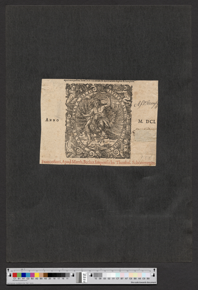 - ANNO M. DCI. / Francofurti,Apud Matth.Becker.Impensis Io. Theobal. Schönvvetter.