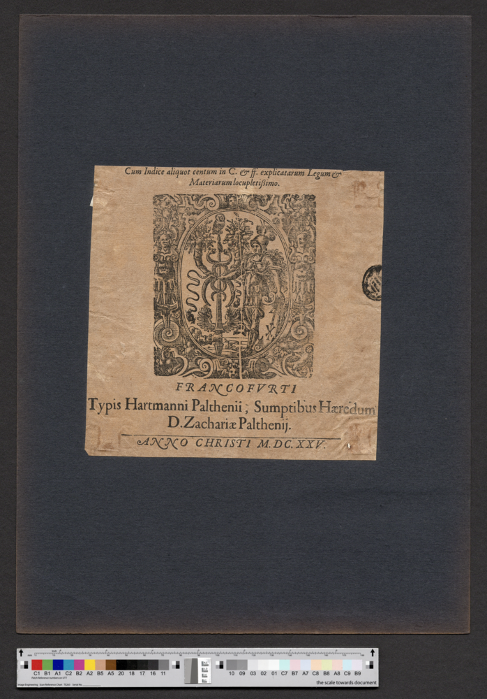 - FRANCOFVRTI / Typis Hartmanni Palthenii, Sumptibus Haeredum / D. Zachariae Palthenij. / ANNO CHRISTI M. DC. XXV.