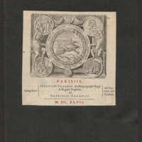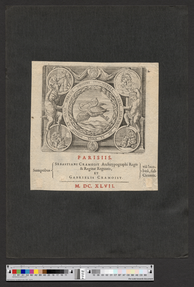 - PARISIIS. / Sumptibus { SEBASTIANI CRAMOISY Architypographi Regis / & Reginae Regentis, / ET GABRIELIS CRAMOISY.} viâ Iaco- / baeâ, sub / Ciconiis. / M. DC. XLVII.