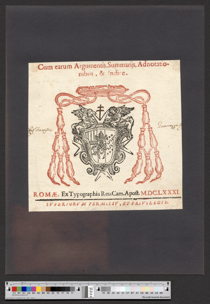 - ROMAE, Ex Typographia Reu.Cam.Apost.M.DC.LXXXI. / SVPERIORVM PERMISSV, ET PRIVILEGIO.